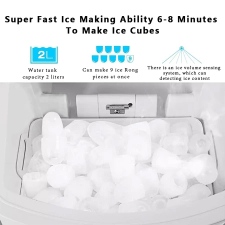 – Efficient ice production: 6-8 minutes of ice production, nine ice cubes at a time, and 60 ice cubes in an hour