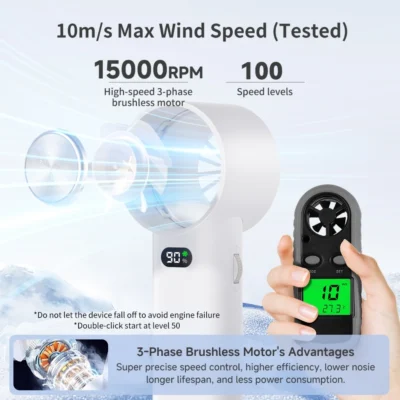 2. 10m/s max wind speed, 13000rpm powerful 3-phase brushless motor, 100 adjustable levels.