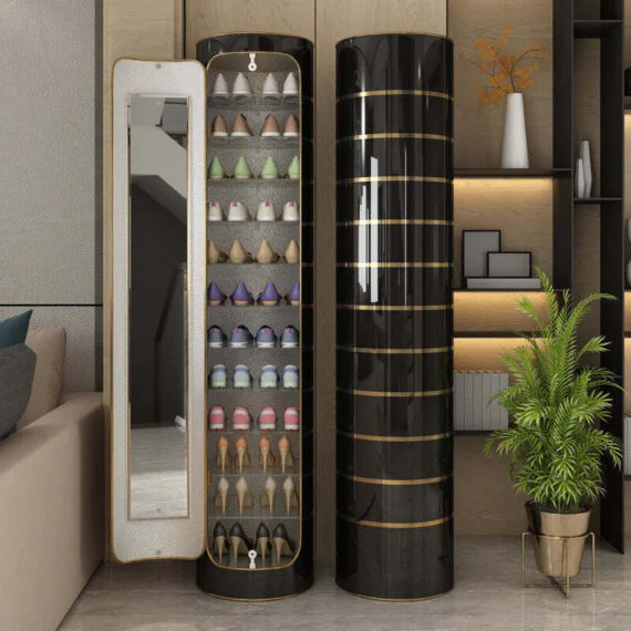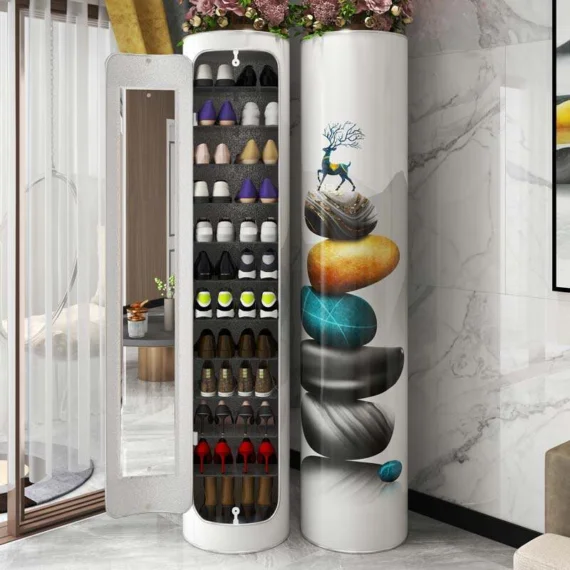 Diameternya hanya 15.7 inci. Rak kasut ini mempunyai storan berbilang lapisan, kapasiti besar, ruang kecil, putaran 360 darjah, rak boleh laras, kukuh dan tahan lama, sedutan pintu yang kuat, kabinet kasut kreatif, dengan cermin definisi tinggi di dalamnya.